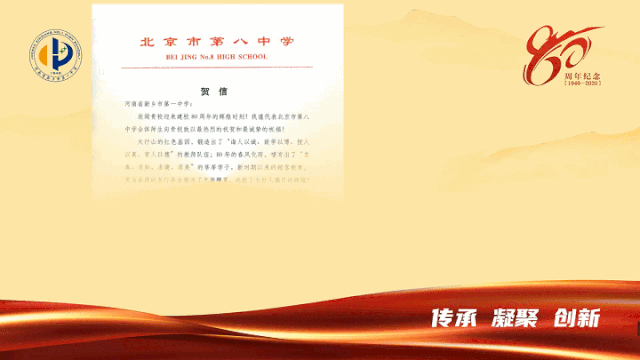复旦大学、上海交通大学、浙江大学、中国科技大学等高校,北京八中、人大附中、上海建平中学等友好单位,共同祝愿新乡市一中继往开来,再创新辉煌!还有很多校友在千里之外,纷纷发来贺电贺信,并通过视频,表达自己的拳拳之心,向母校生日致敬。